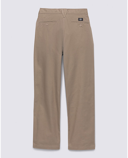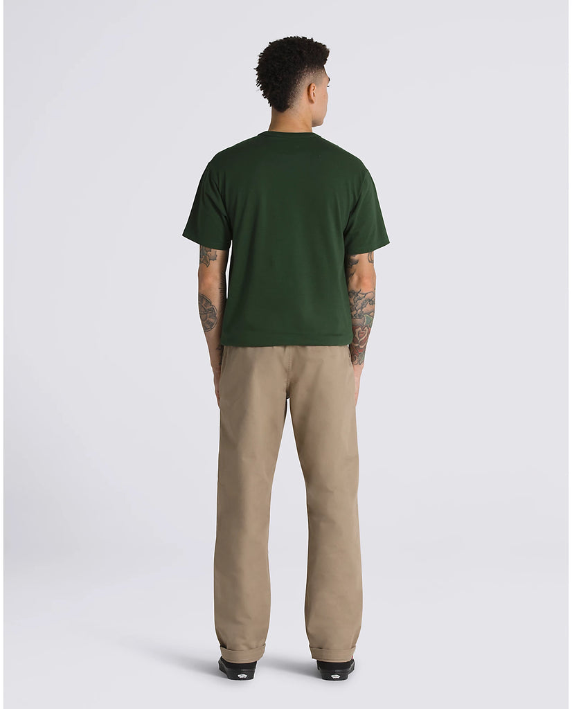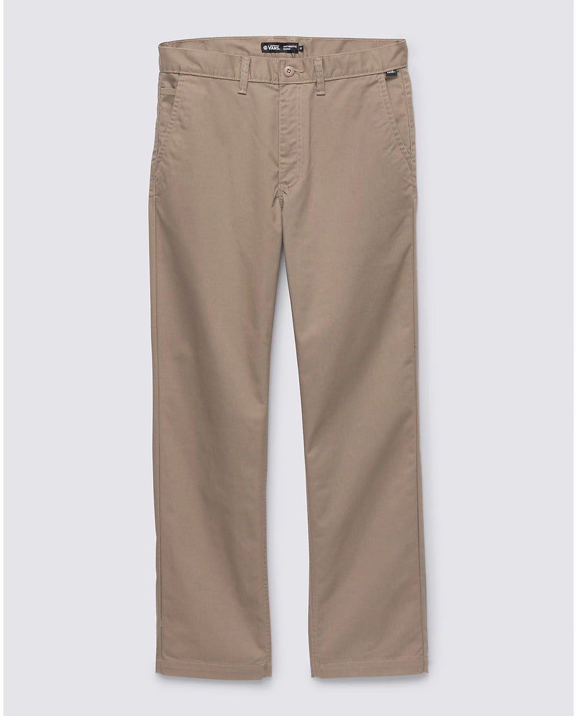 A versatile chino pant that delivers style and functionality, the Authentic Chino Relaxed Pants lets you stop worrying about your gear and focus on your skating. This relaxed chino pant features front hand pockets with coin pocket, rear welt pockets with button closures, and embroidered 'Drop V' bartacks for reinforcement with a heritage twist, checkerboard twill taping on the internal fly facing, and the flag label sewn into the hem for added branding when legs are cuffed.