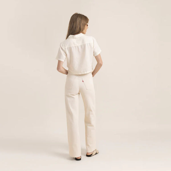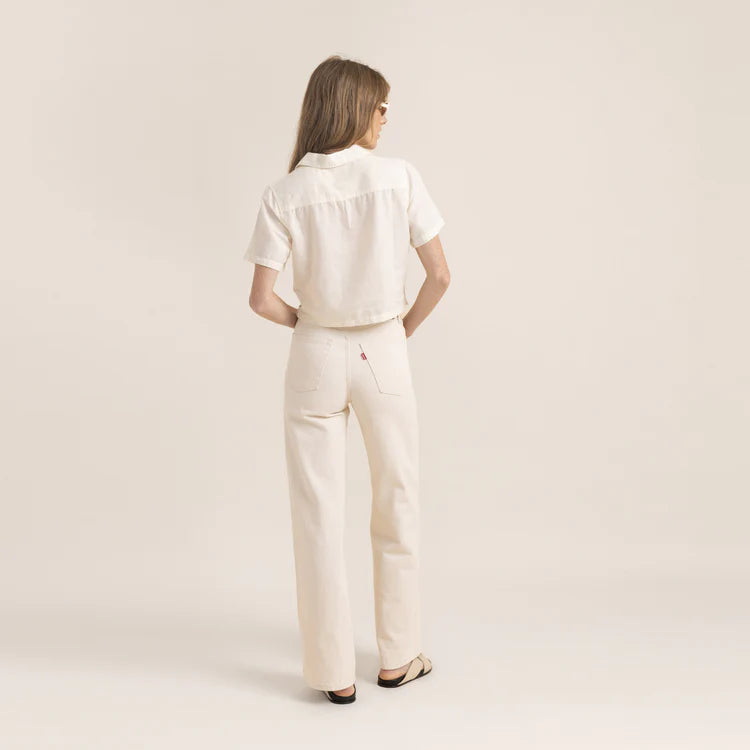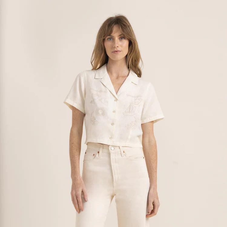 The devil's in the details and that's why we love The Camp Shirt. Embroidered with symbols from our search for the fountian of youth, this effortless cropped linen tee brings us back warmer weather every time. Featuring front darts for a more fitted look.