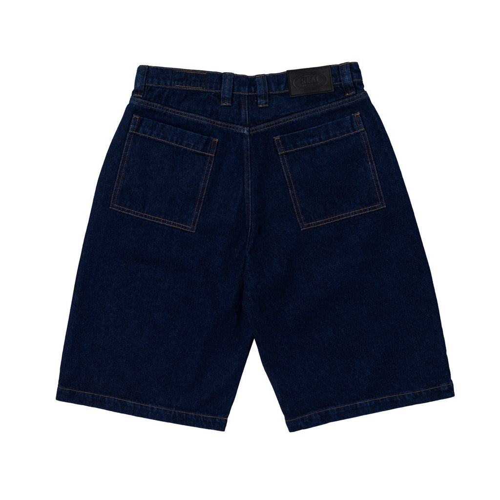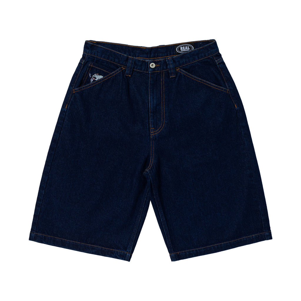 - Denim shorts with an embroidered graphic in the front right pocket.