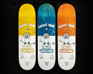 Mike was a huge inspiration to us here at DLX with his early efforts to make custom shirts for shops during the Pandemic. Having him design these decks feels like a full circle, and we hope you dig them. Three sizes are 8", 8.25", and 8.5”, ast veneers.
