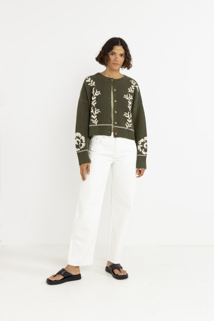 The Antique Floral Crop Cardigan in Olive combines cozy knits with feminine charm. Its cropped fit and contrast floral artwork make it a perfect layering piece for breezy evenings.