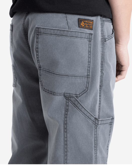 - Five pocket styled canvas workwear pant with front right on seam pouch pocket, self fabric binding over hard angled hand pocket and front knee reinforcement