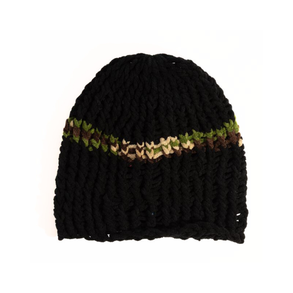 - Loose, skull cap fit beanie done in chunky, homemade inspired yarns