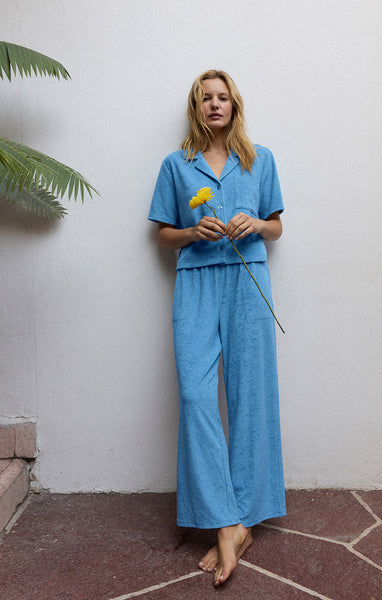 - Wrap yourself in cozy comfort with this button-up top, made from plush loop terry cloth fabric. Featuring a relaxed fit, short sleeves, and a classic chest pocket, it’s perfect for lazy mornings or lounging all day.