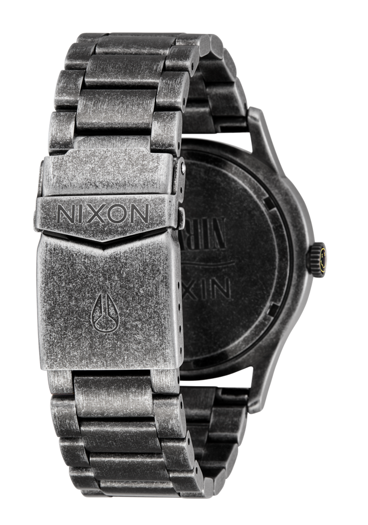 Your eyes are not playing tricks on you.  Meet the Nirvana Sentry Wobble.  Nixon's iconic mid-size analog watch has been bent, molded, and contorted to match Cobain's hand drawn iconic smile graphic found on the dial and crown.  The face pops with depth and detail, and the solid stainless steel case, hardened mineral crystal, and waterproof rating of 100m allow for everyday use.  The limited edition all-black version are individually numbered on the caseback with only 152 available worldwide.