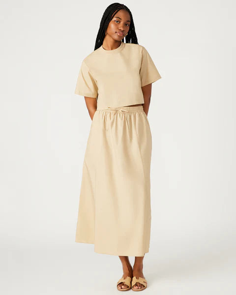 The SUNNY skirt features a comfortable elastic waistband, front tie, and convenient side pockets. This maxi length A-line skirt is perfect for both casual outings and dressier occasions.