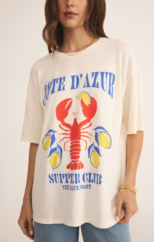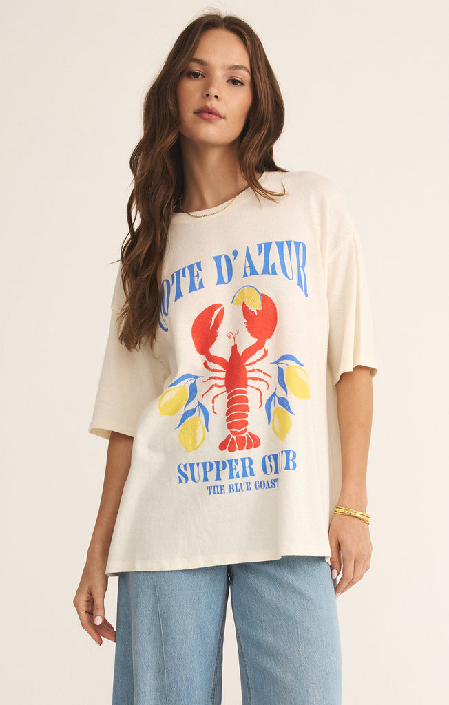 Channel effortless coastal vibes in this ultra-comfy graphic tee, featuring a "Côte d'Azur Supper Club" screen print with a vintage-inspired lobster graphic. With its soft jersey fabric and easy oversized fit, it’s the perfect laid-back layer for seaside strolls or long, lingering dinners.