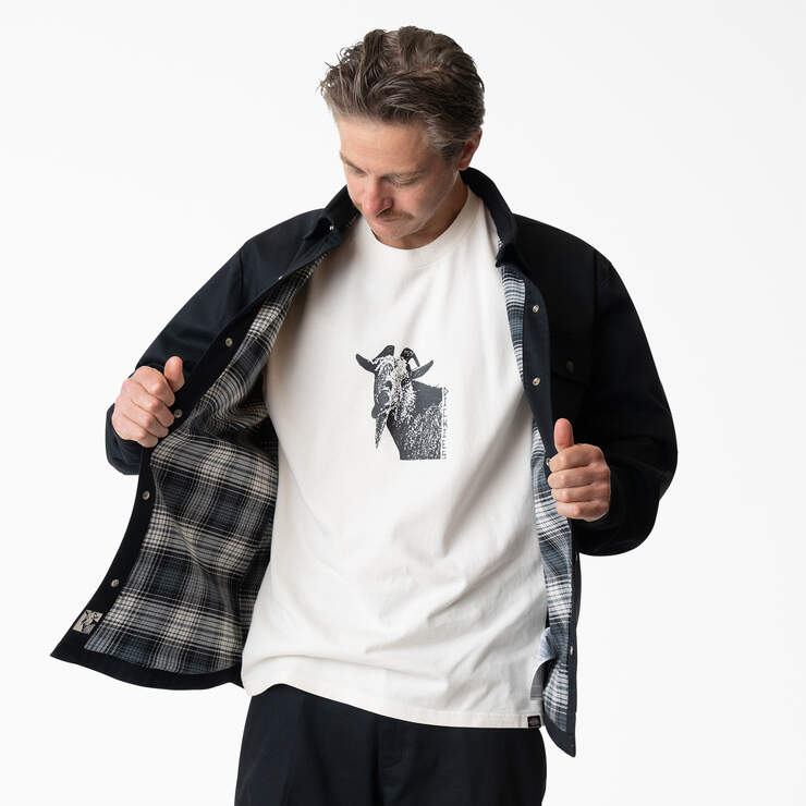 Mike Anderson's Pro Collecion—the blueprint for skate-anything skateboarders—took inspiration from classic styles he’s been wearing since childhood and added custom details tailored for skateboarding. T he lined shacket features a relaxed fit, flannel lined interior, elbow patches, side seam waist pockets, and a snap front closure. Mike uses a goat graphic as his signature hidden under the placket in homage to his pet goat “Snowflake.”