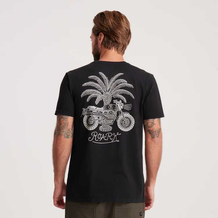 Hit the road with the spirit of adventure in the Moto graphic tee. This standard fit black short sleeve t-shirt features a subtle palm tree and Roark logo detail on the front, while the back showcases an intricately drawn motorcycle under a towering palm. Crafted from soft, durable cotton, this shirt is designed to keep up with your travels.