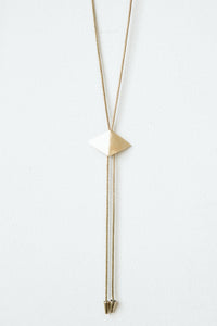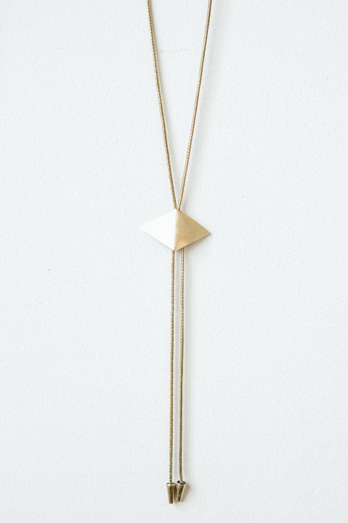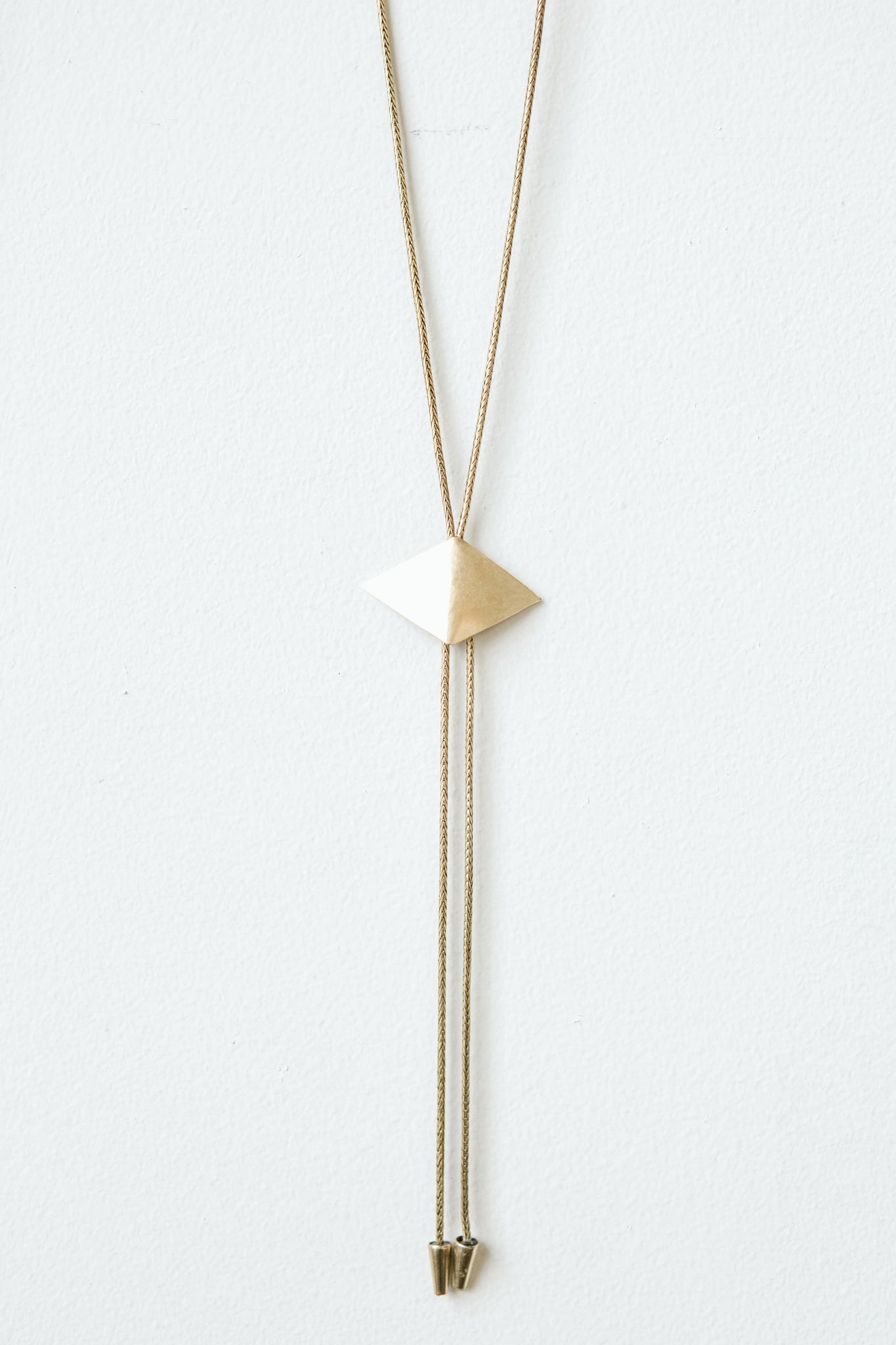 2-1/8" Hand-cut brass diamond. Pendant slides on 36" brass snake chain.