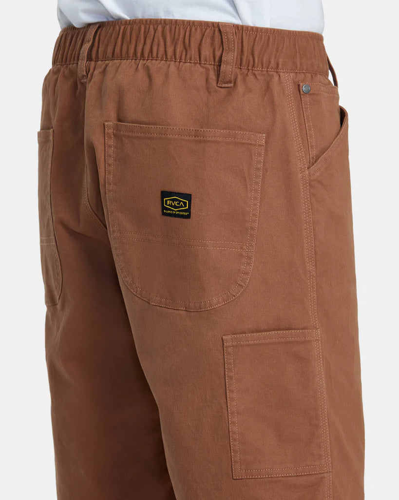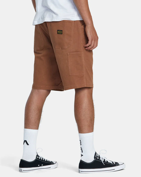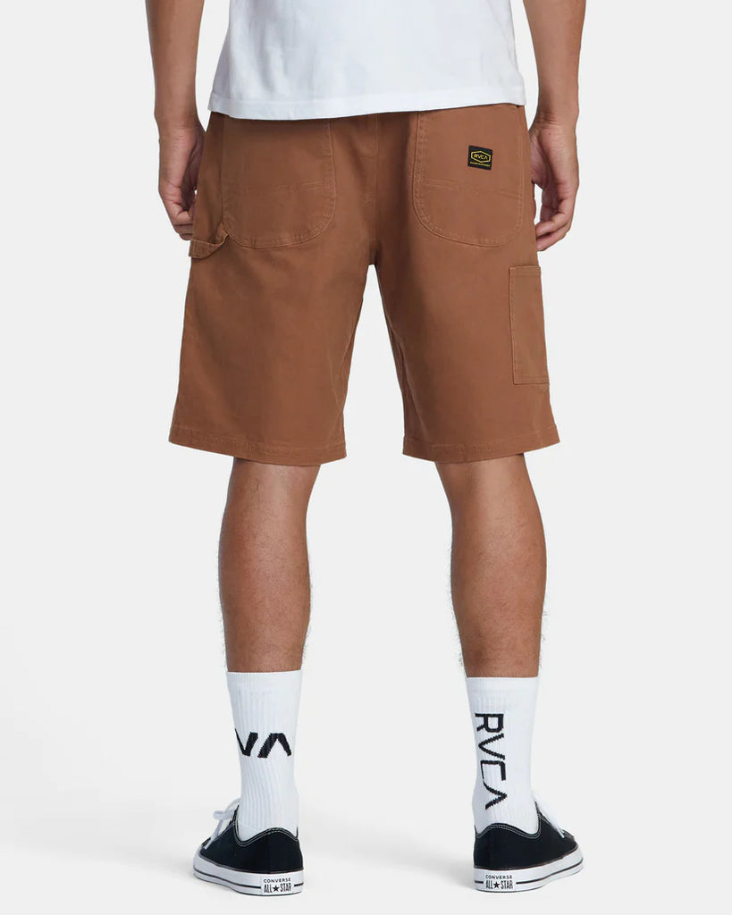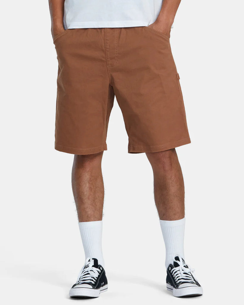 Experience RVCA's Dayshift Collection Americana 17" Carpenter Shorts, crafted from blended cotton fabric with a heavy enzyme wash for superior softness. These workwear shorts offer a regular fit, faux fly, and elastic waist with drawcord closure, plus side and back pockets for bonus functionality.