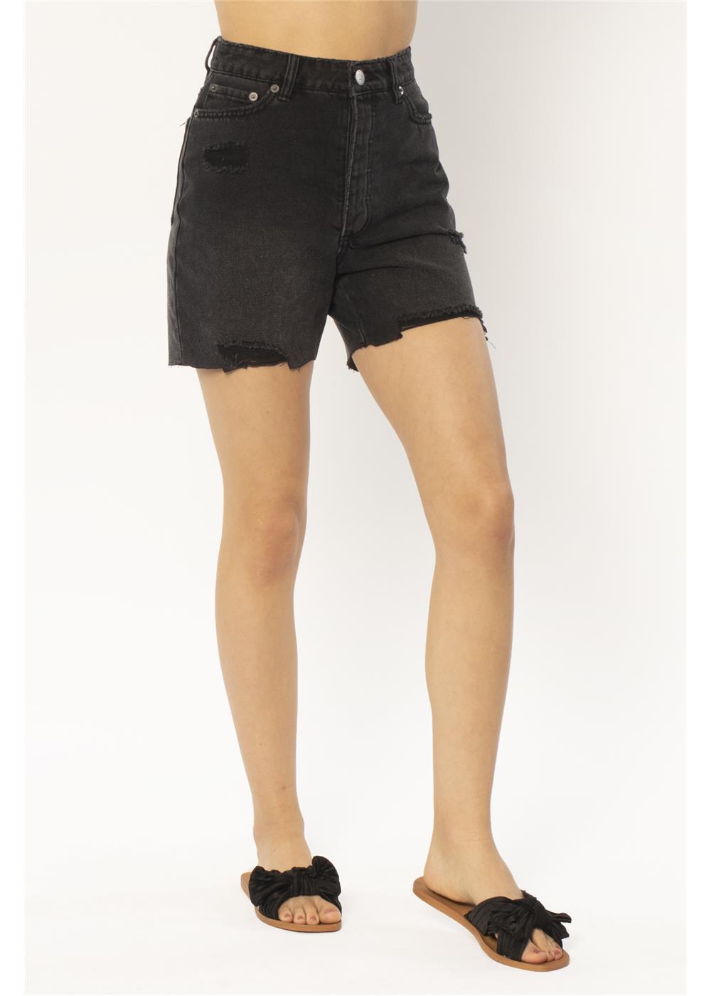 The Bella Denim Short is a high waisted mid length rigid denim five pocket short. It features a raw edge hem and distressing throughout.