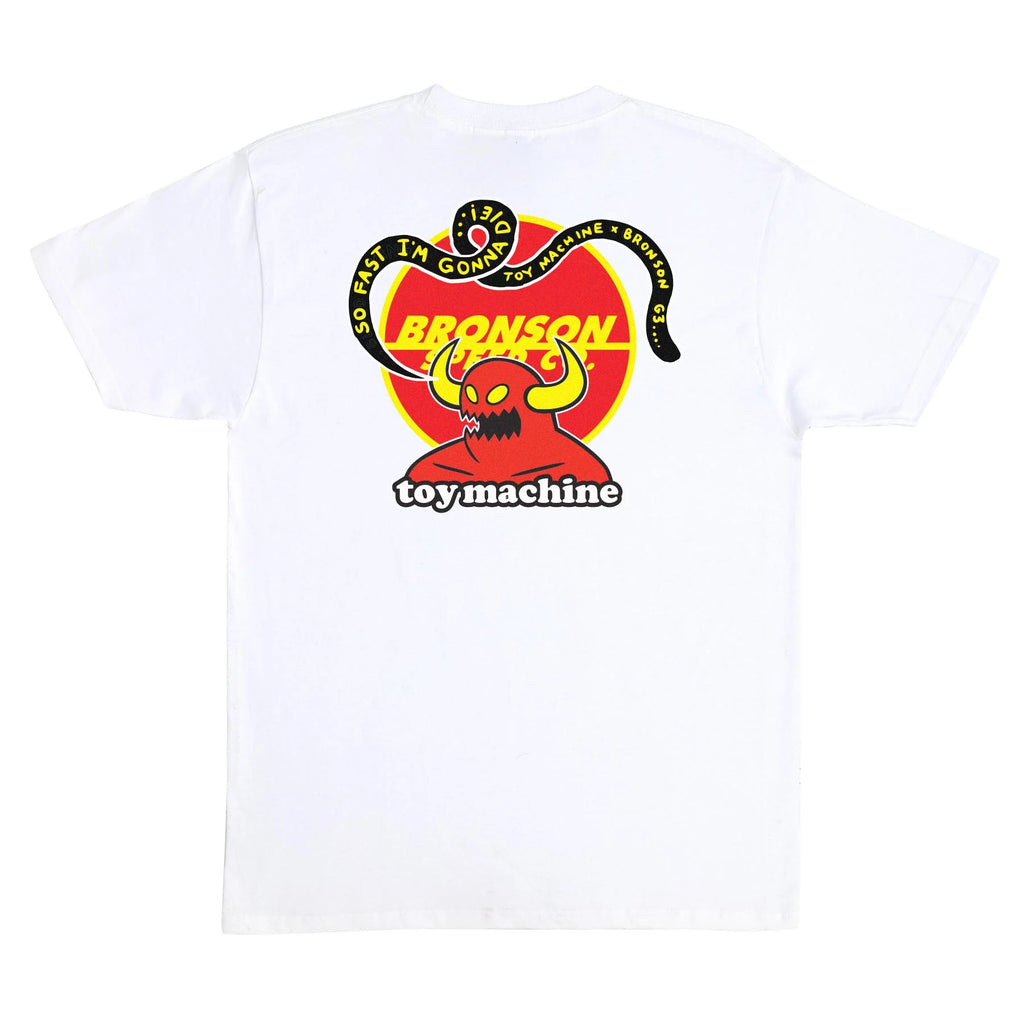 Next Generation Bearings and the Bloodsucking Skateboard Company meld to present this limited seasonal offering. The new Bronson x Toy Machine regular fit, short-sleeve t-shirt features medium front and large back Bronson x Toy Machine logos printed in soft hand ink. Fabric weight and thickness may vary by color. Select color and click the "Details" tab to see exact weight by colorway. Bronson Speed Co. So Fast I'm Gonna Die.