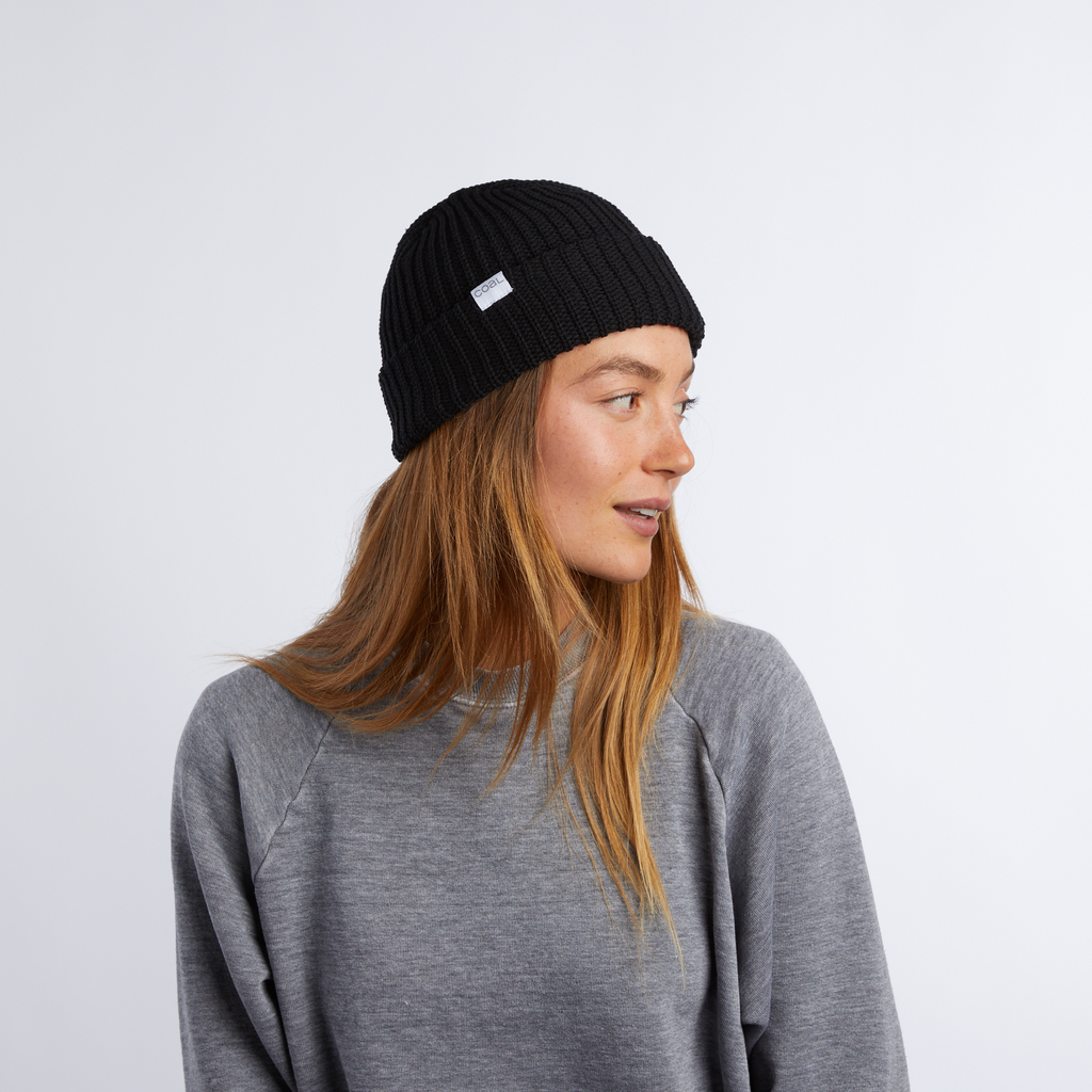 The Eddie is a classic rib knit beanie made with a recycled cotton yarn, created from the scraps of the apparel manufacturing process.  The Eddie is a more loosely knit hat great for larger noggins or a more roomy fit, and the recycled cotton is durable for easier care. Beanie can be worn rolled, folded, or un-cuffed for a slouchy fit.