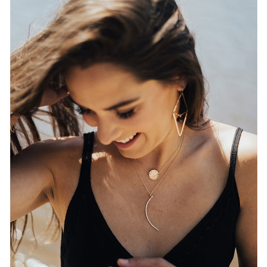 Token's crescent moon necklace is lightly hammered for a beautiful shine. This necklace looks great alone or layered with our Full Moon Necklace. DETAILS The crescent pendant measures 2.5" long Spring hook clasp on a 17" chain plus a 1" extender chain Each piece of Token Jewelry is handmade to order in their Eau Claire, WI studio. Please allow for natural variations that may occur.