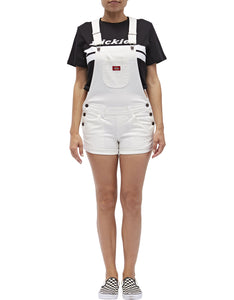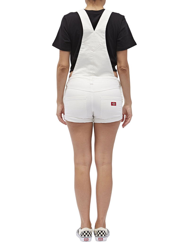 Dickies stretch shortalls with front bib and adjustable self straps with a 3" roll hem and side button entry. Features Dickies icon red label on back pocket.
