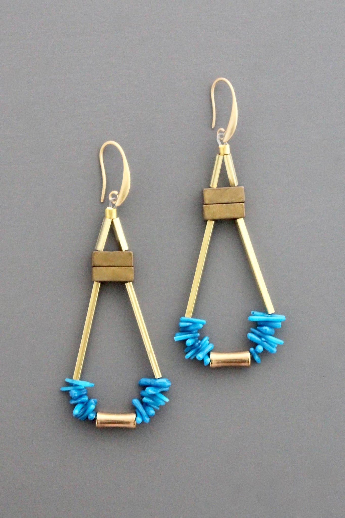 18k gold plated brass hook earrings with electroplated hematite, blue bamboo stick coral, and brass. Each pair weighs .43 oz. and measures 3.5 inches long.