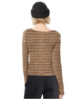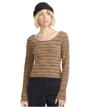 This fitted sweater knit top features a flattering scooped neckline and a cozy polyester-nylon blend. The wide rib knit adds texture, while the metal badge at the hem provides a subtle branded touch. Perfect for layering or wearing solo, it's your new go-to for effortless style. Featured here in bear brown.