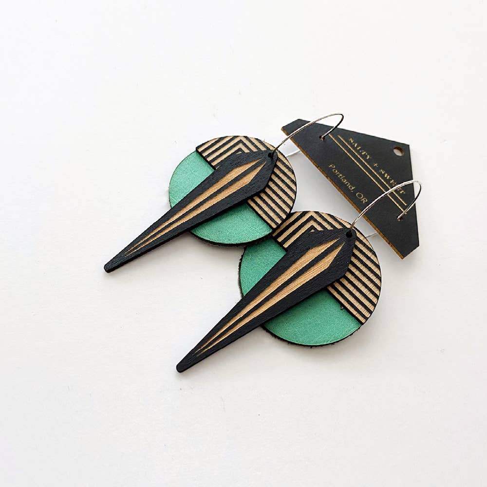 Lightweight 2-layer seafoam leather and birch statement earrings inspired by architecture.