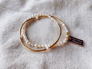 Our Hepburn Twin Wrap Bracelet Collection is handmade in Minnesota. You plant one tree with each purchase. These layering stretch bracelets are made with gold plated beads on a stretch cord. One size fits most.