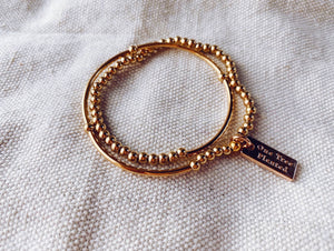 Our Hepburn Twin Wrap Bracelet Collection is handmade in Minnesota. You plant one tree with each purchase. These layering stretch bracelets are made with gold plated beads on a stretch cord. One size fits most.