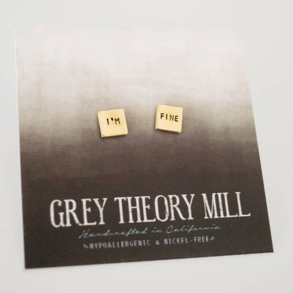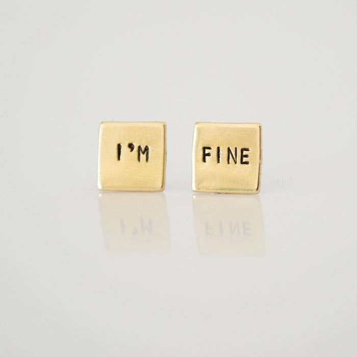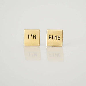 Hand Stamped, square shaped, brass earrings that read “I'M FINE” for those days where you're actually not fine, but you know everyone will be asking you ?_?