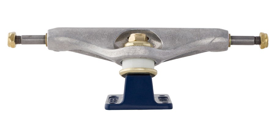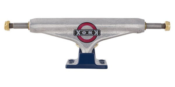 Independent Trucks Tom Knox pro trucks feature polished silver hanger with Knox pad print and signature laser etch, flat navy blue baseplate, white cushions & pivot cup, and gold hardware.