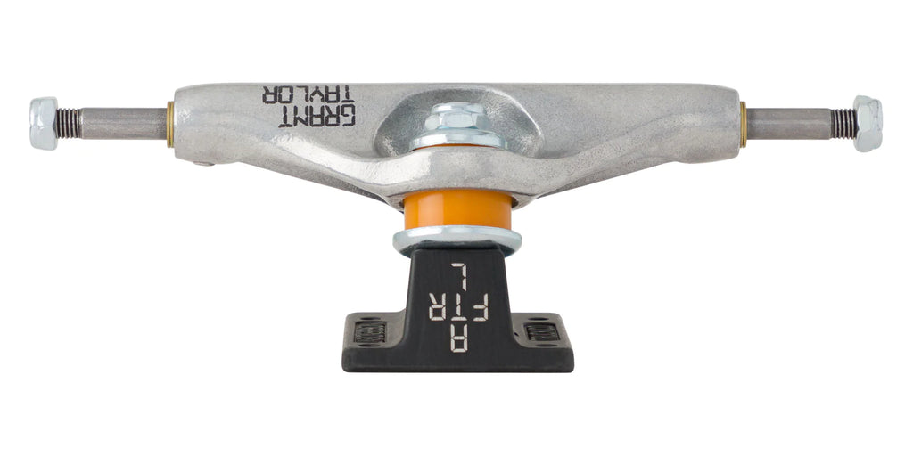 Independent Trucks Grant Taylor Pro Stage 11 Hollow features polished silver hanger with GT pad prints front and back, flat black powder coated baseplate with laser etched logo on rear kingpin housing, classic orange cushions, and silver hardware.