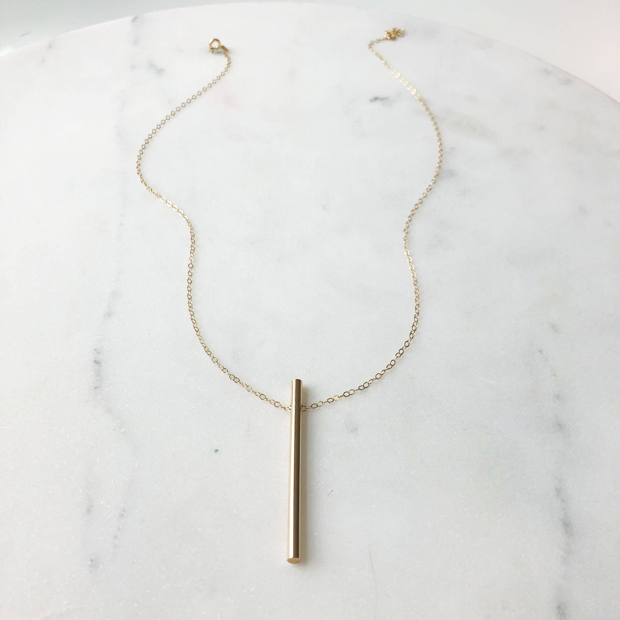Our newest wear-with-anything necklace features a solid metal pendant suspended from our delicate chain for a super sleek and minimal look.