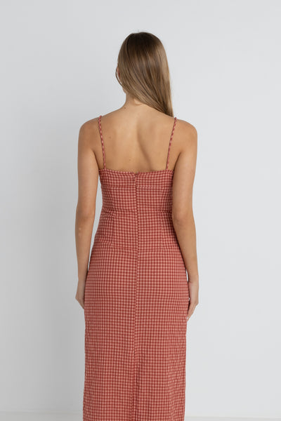 he Lola Check Gathered Midi Dress in Red is a celebration of coastal femininity. Made from a yarn-dye checked cotton-poly blend, it features thin straps, a front keyhole with tie, and a slim fit through the body. Inspired by vintage looks of the past, It's an ideal dress for sun-drenched gatherings, beachside strolls, and balmy evenings with friends