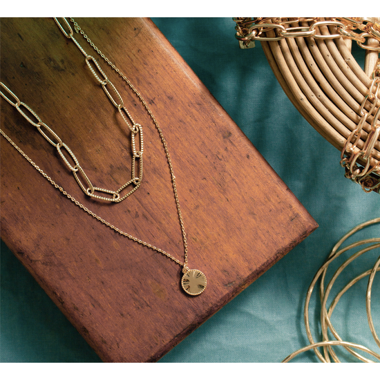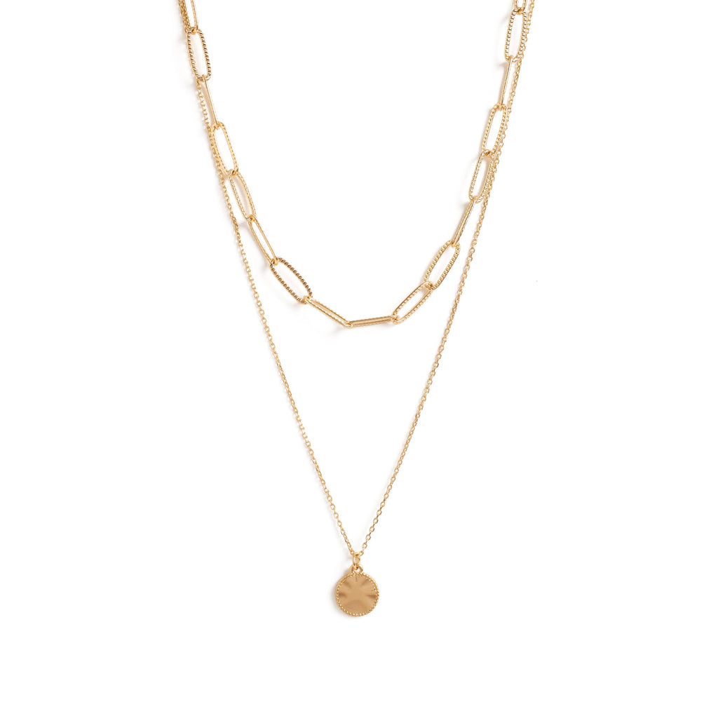 Necklace - 2 layer chain - textured link chain and simple pendant (Gold), .5" pendant, 15" long