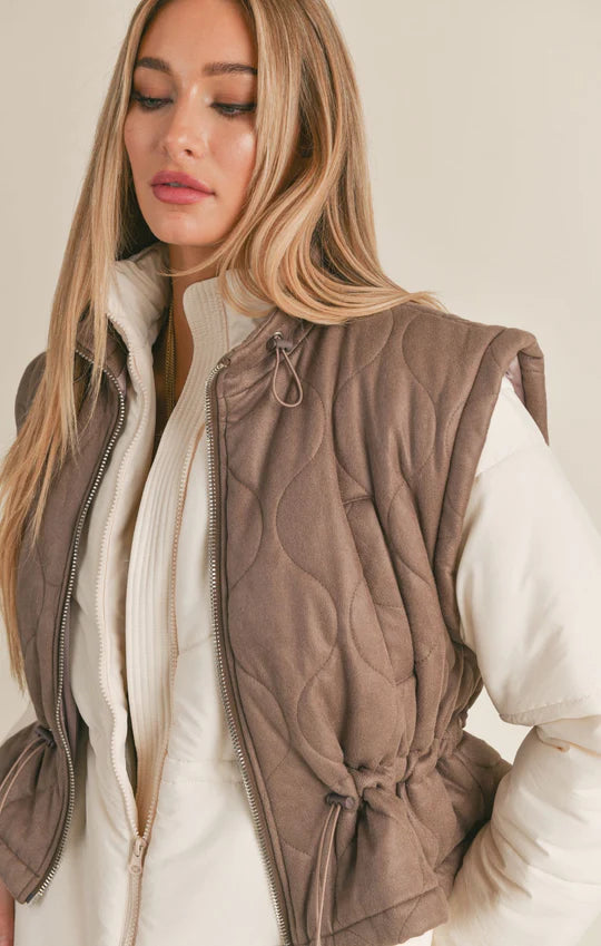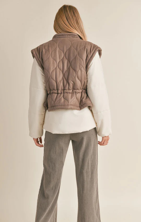 Introducing our quirky and versatile Nightshade quilted vest. With its toffee color and drawcord feature, this vest is a great layering piece for any outfit. Stay stylish and warm with this playful addition to your wardrobe.