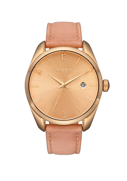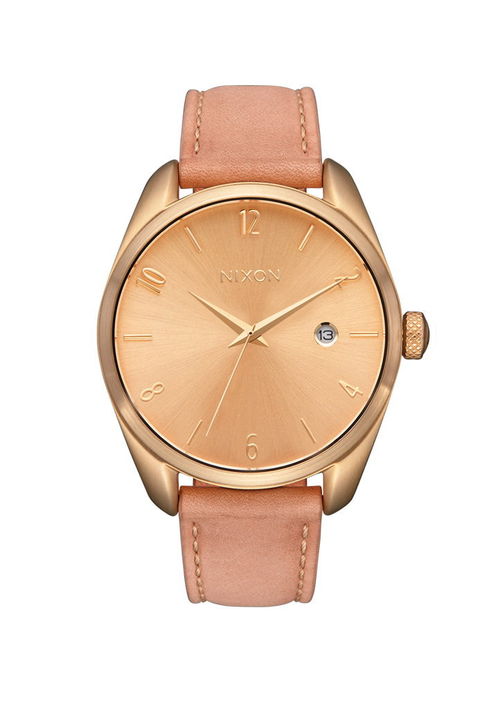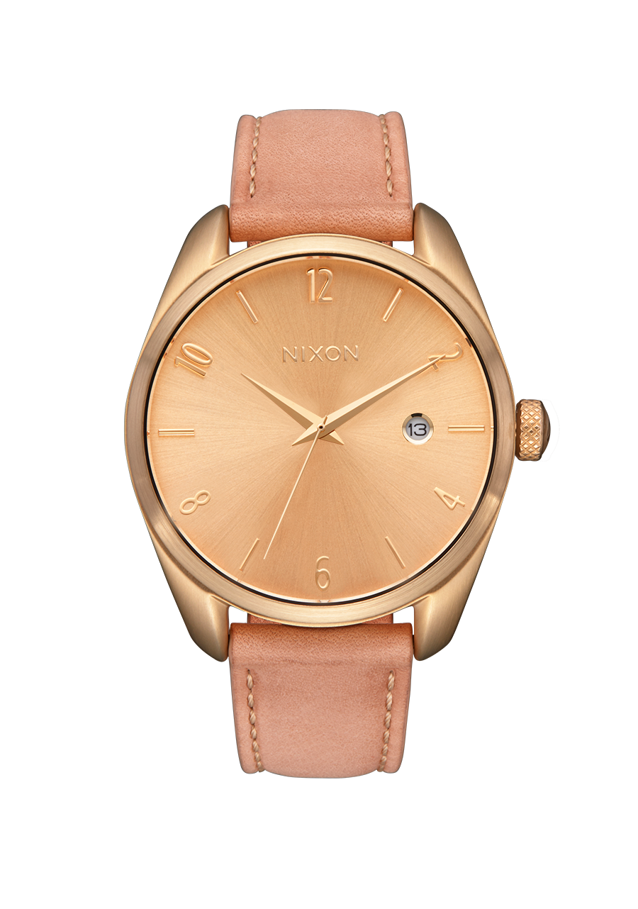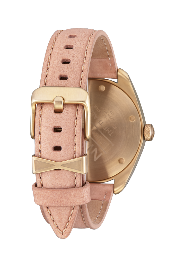 Considered design elements double to add durability and aesthetic appeal. The slender silhouette features soft curves on the lug that point toward the perimeter stitching along the band until you see the custom, solid, stainless steel bow-like looper and Nixon debossed buckle.