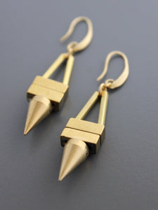 18k gold plated brass French hook earrings with brass tubes, plated hematite, and brass spikes. 2.25 inches.