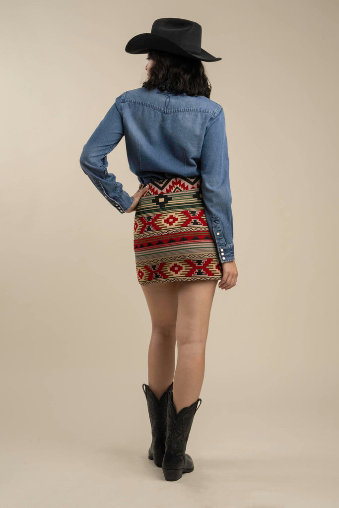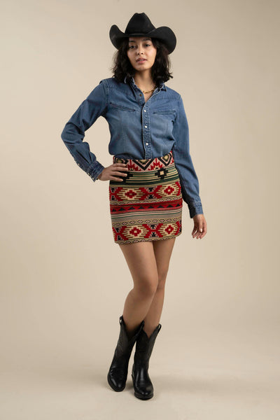Southwest style, but make it sharp. Bold patterns, clean lines, and just the right amount of throwback. Snug at the waist, fitted through the hips, and cut to mid-thigh—the Raquel Skirt is designed for whatever the day (or night) calls for. Pair it with tall boots and a denim shirt or strappy sandals and a silk tank. Either way, it’s got just enough flair to stand out, and just enough classic to never go out.