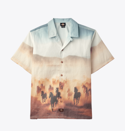 Relaxed fit. All-over print. Convertible collar. Side vents. Short sleeve. Camp shirt styling.