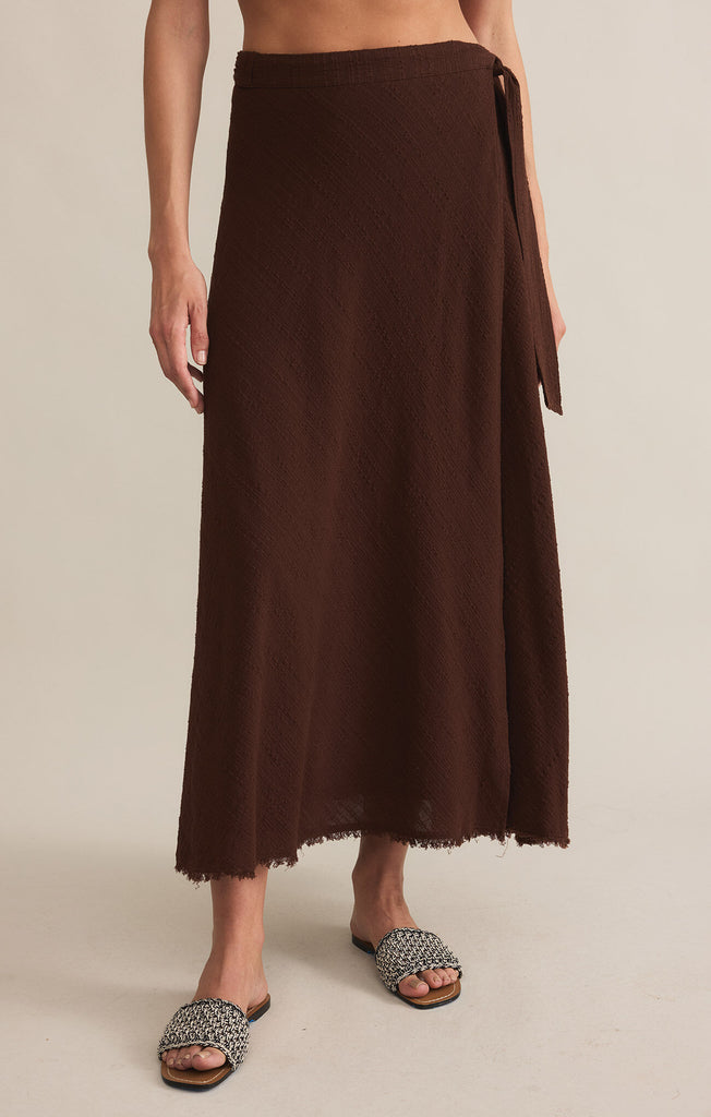 Light and airy, this textured cotton wrap skirt features a mid-rise fit, tie waist, and playful fringe hem detail. Unlined and easy to style, it’s perfect for sunny days and warm nights.