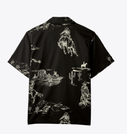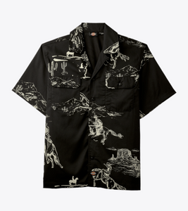 Relaxed fit. All-over print. Miter Chest pockets with flaps. Convertible collar. Side vents. Camp shirt styling.