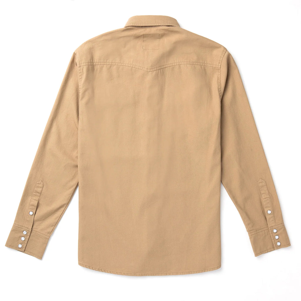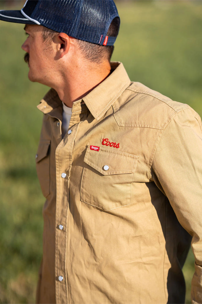 Western Heritage at its best. Bringing back the Reagan Pearl Snap for the second year in a row, we are proud to introduce a khaki colorway, exclusive to our Seager x Coors Banquet collaboration. A pearl snap masterpiece made of quality light-weight Cone Mills Denim (one of the most reputable denim mills in the world), we ran this 100% cotton broken twill denim through an enzyme wash to loosen up the feel and texture.Constructed with durability in mind, we’re certain this chambray has a long life of good times on the hunt in its future. Runs in an athletic/slim fit. FEATURES: