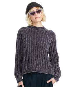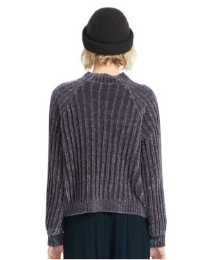 Embrace your inner savage with this cozy mock neck sweater. Crafted from soft polyester chenille, it offers a relaxed fit with stylish raglan sleeves and blouson cuffs. The metal badge at the waistband adds a touch of edge to this casual-chic piece. Perfect for those who want comfort without sacrificing style. Featured here in dark grey.
