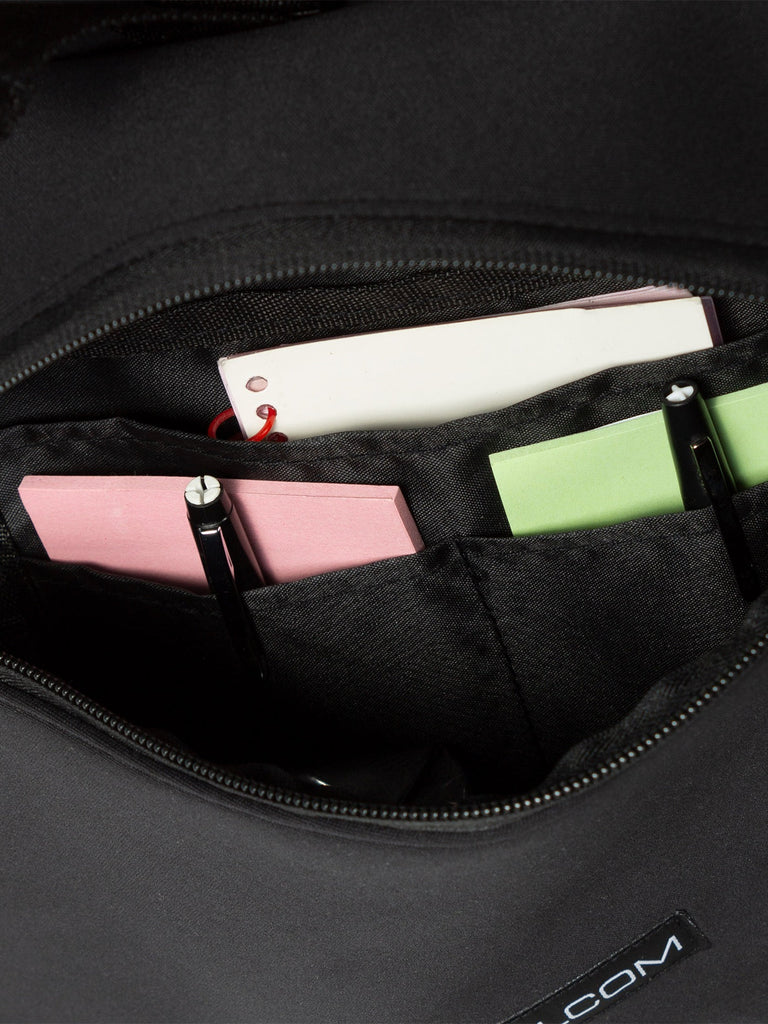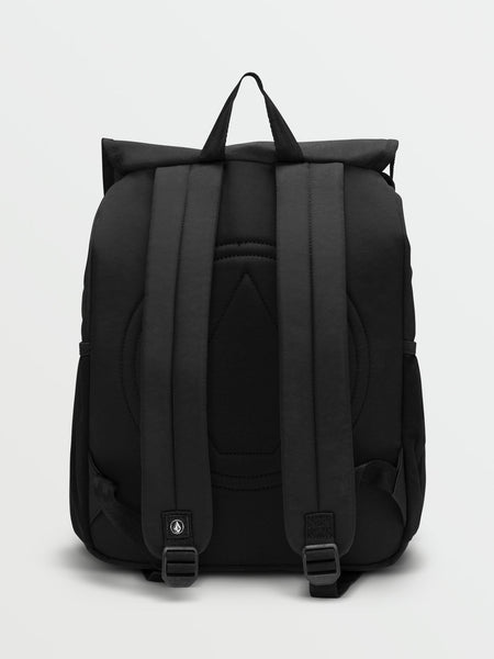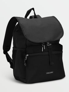 The So Jaded Backpack is a stylish and functional women's backpack with a large main compartment with a front flap and cinched drawstring closure, providing easy, but secure access to your belongings. It has slip side pockets for additional storage and a back panel with logo stitching and padded shoulder straps for comfort. The backpack measures 12" x 6" x 17" and is finished with a woven Volcom patch label.