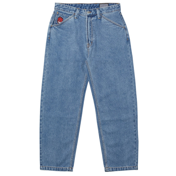 - 12.9oz 100% cotton five pocket relaxed fit medium stone washed denim pant with embroidered logos.