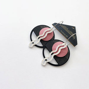 NEW for summer 2020! Lightweight statement earrings inspired by FUN and architectural details. Faux-stone acrylic with dusty rose pink leather. 2" at longest point.