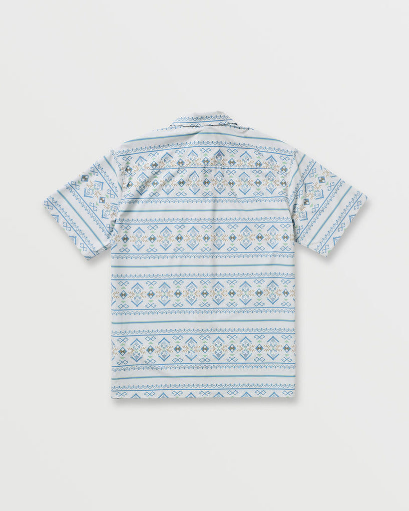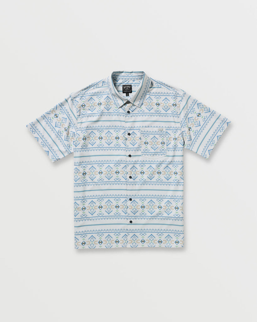 The lightweight Surftrek Perf Short Sleeve Shirt, crafted from partially recycled fabric, features a surf-inspired geometric print.  Billabong's regular fit offers a versatile, comfortable look with a collared neckline, chest pocket, and straight hem.