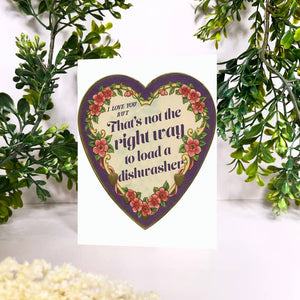 I love you, but the bowls don't go there and if you put the cast iron skillet in there one more time I might lose it. There are a few universal truths in this world and one of them is that you will have a fight with your roommate/husband/wife/significant other/child/mother in law about how to correctly load the dishwasher. I'm not sure if there is a scientific answer to what is the "correct" way to do it but I'm going to go out on a limb and say I am the only one doing it right. And I guarantee if you ask my husband he will say his way is the correct way and so it goes until the end of time. With a super cute retro Valentine style heart and flowers design for a sweet vintage look. The perfect card for Valentine's Day, anniversary, birthday or just because we literally had a fight about this yesterday.