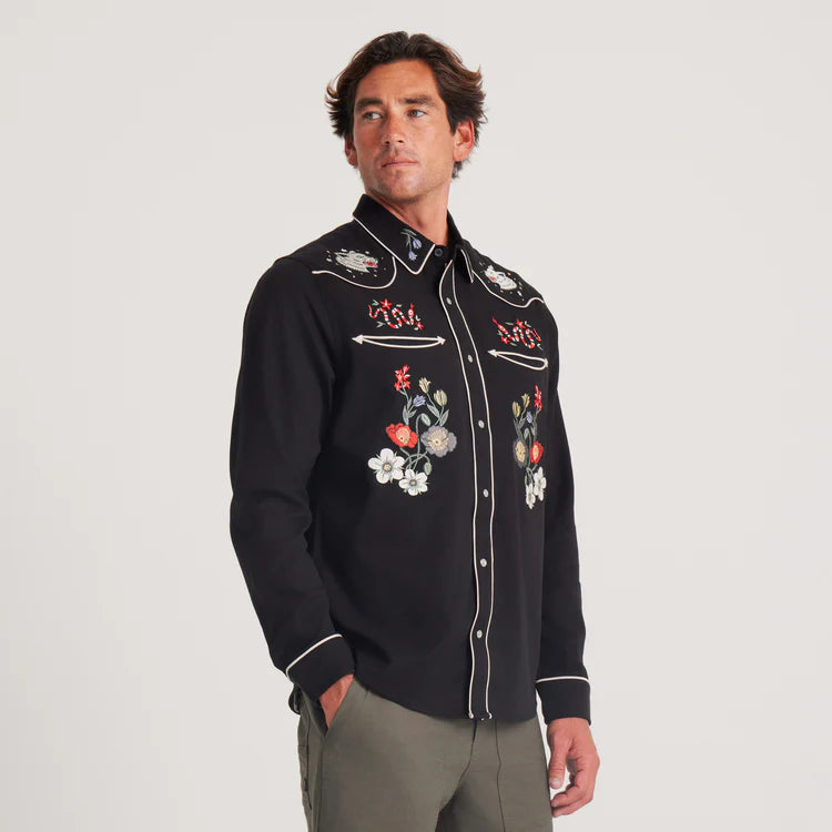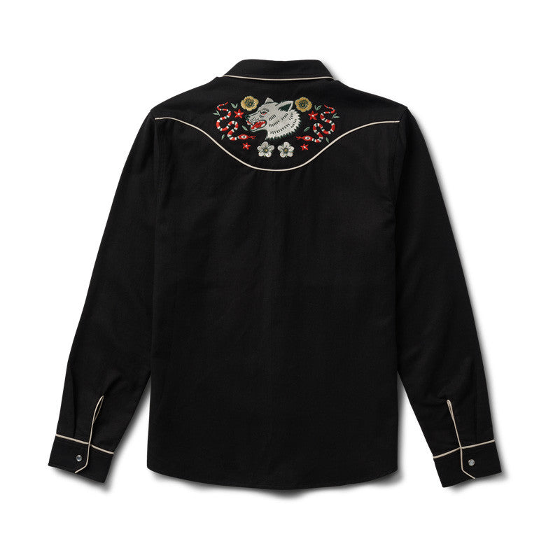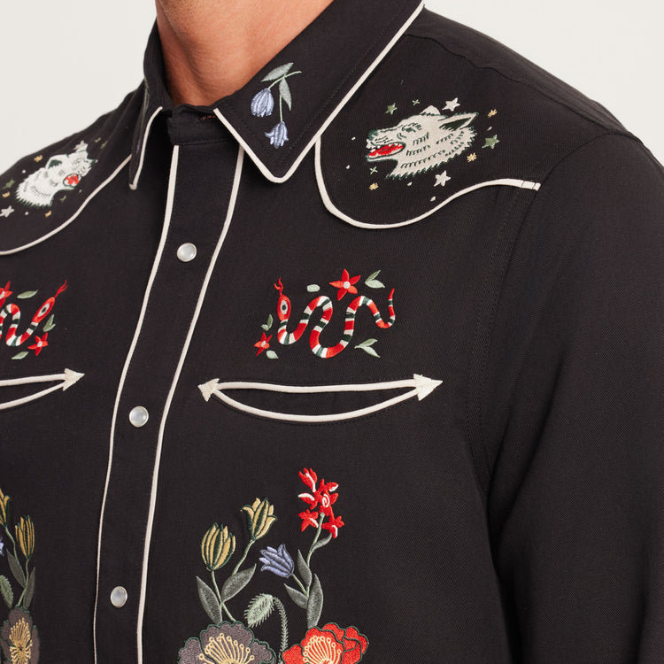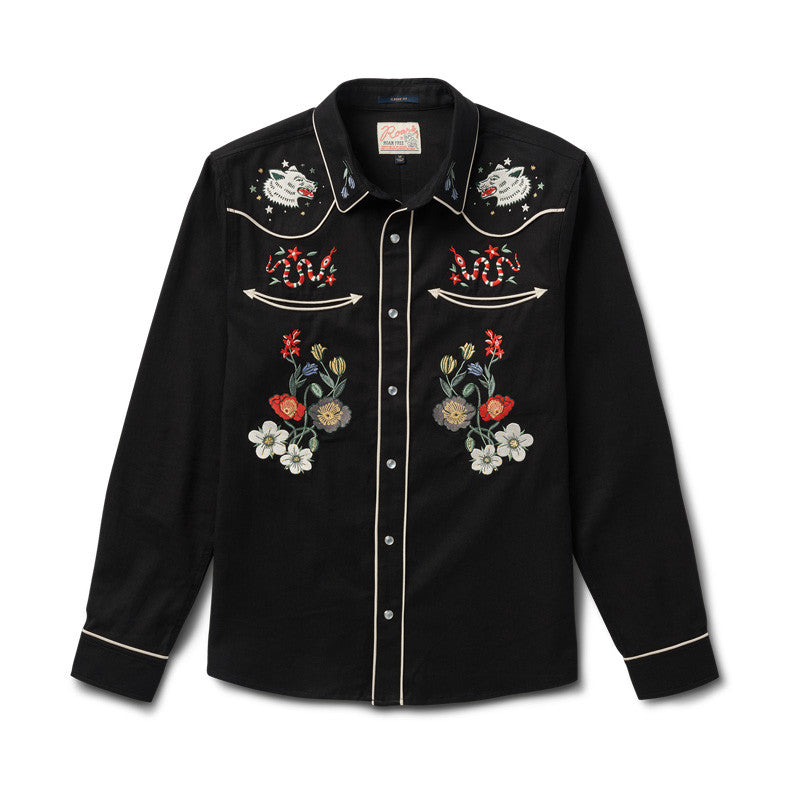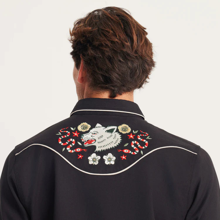Roark's latest version of its iconic embroidered western shirt draws inspiration from The Lone Wolf and the wild spirit of Norway, bringing a fresh piece of wearable storytelling to our collection that only Roark could pull off. Featuring pearl snaps, custom embroidery, and contrast piping, The Lone Wolf was built to be a showstopper.