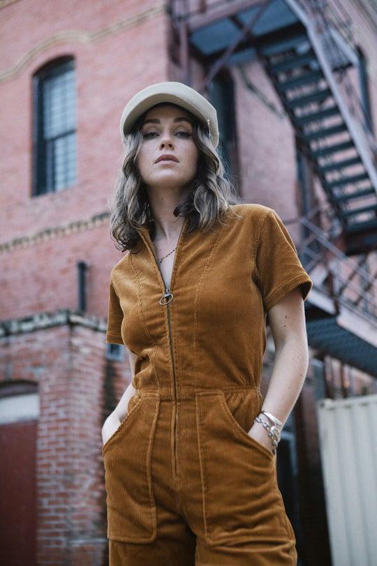 Your search for the ultimate grab-and-go women's jumpsuit ends here. This soft yet sturdy cotton corduroy one-piece is built for life's adventures. Multiple surplus pockets let you stash all your must-haves close by. And the vintage-inspired style adds an effortless edge to any look, seamlessly transitioning you from morning coffee runs to evening hangouts. Comfort, versatility, and utility—all in one easy jumpsuit.