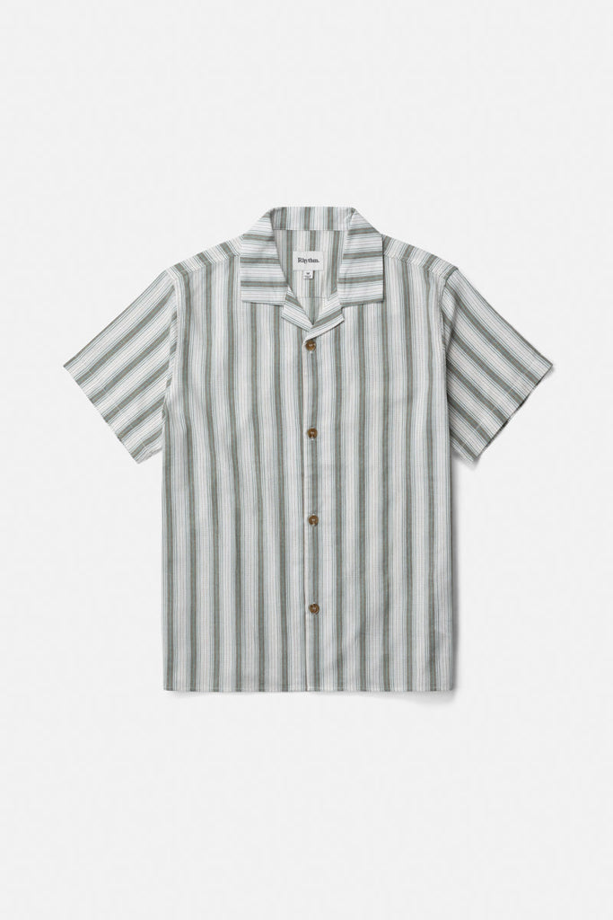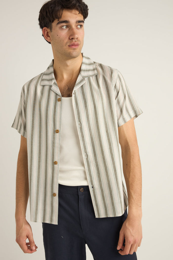 The Vacation Stripe Ss Shirt in Fern blends elevated style with functional wear-ability, crafted from 100% cotton. A versatile essential designed for everything from beach days to off-duty afternoons.
