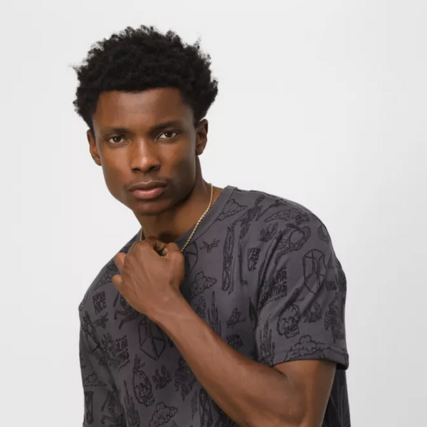 The Doom Bloom T-Shirt is a 100% cotton jersey knit tee with short sleeves and an allover, tonal jacquard print. Model is 6 feet tall and wearing a size Medium.