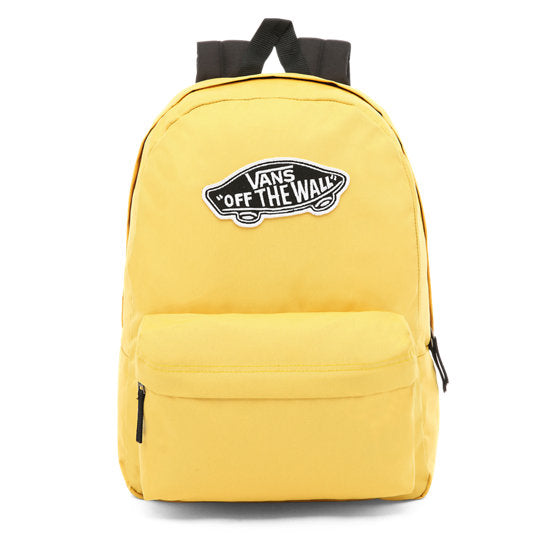 The Realm Backpack is a 100% cotton two-pocket backpack with 100% polyester trim and lining, a zippered main compartment with an interior laptop sleeve, a front organization pocket, adjustable padded straps, and debossed lining at the interior back panel. Measuring 16.75 L x 12.75 W x 4.75 D inches, it has a 22-liter capacity.